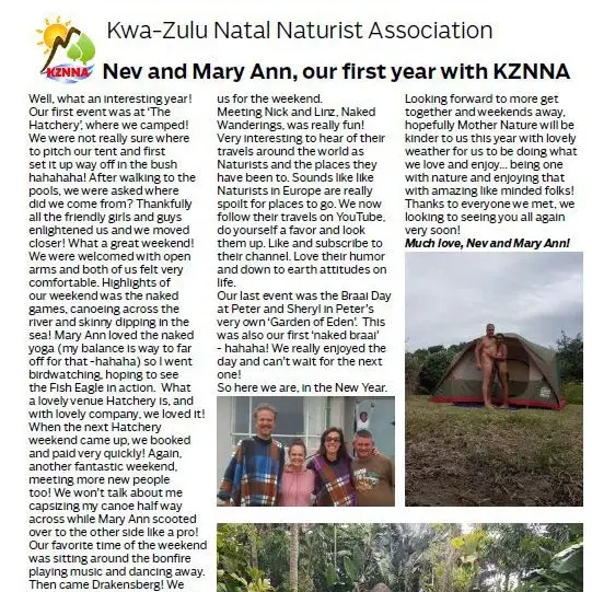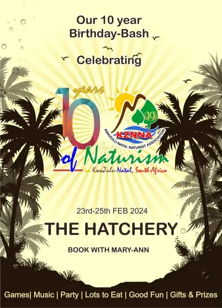 On February 14th, 2024, KZNNA, the Naturist Association of KwaZulu-Natal, marked a significant milestone as we turned a glorious ten years old. To commemorate this landmark occasion, the management committee, with the help of some members of our community, organized a jubilant birthday bash from February 23rd to 25th at The Prawn Hatchery, setting the stage for a three-day celebration of naturism in the province.